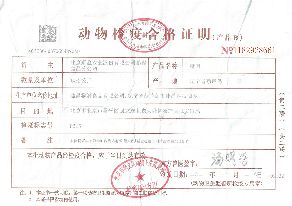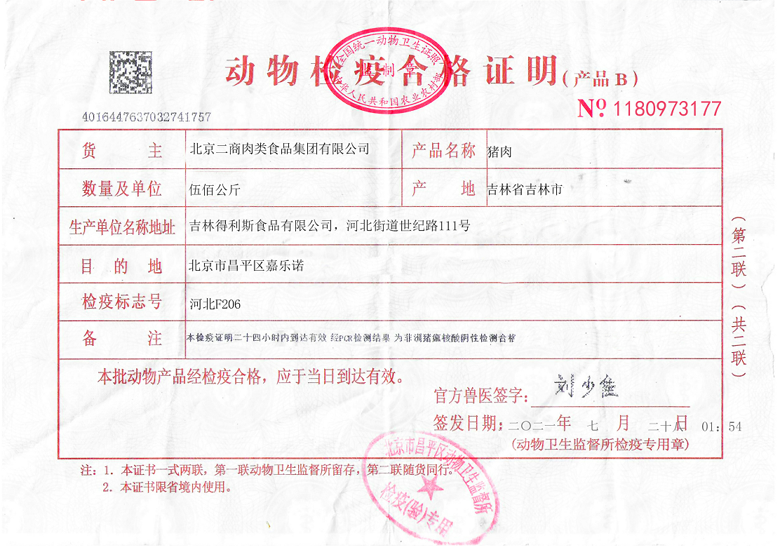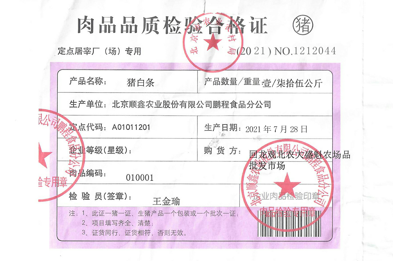 豬肉使用大紅門第五肉聯(lián)廠豬肉類,由五肉聯(lián)廠家在五肉聯(lián)廠內(nèi)進(jìn)行分割裝箱,箱體密封完整,箱外附有該批次豬肉出廠檢測(cè)證明。五肉聯(lián)冷藏車送至嘉樂(lè)諾馬上進(jìn)行冷藏銜接配送,
